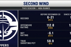 快船主場迎戰黃蜂,轉播方對比了快船前27場和近11場各項數據對比。