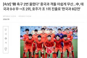 韓媒標題為:韓國足球兩度飲恨 與中國對決遺憾落空(中國0-0戰(zhàn)平泰國獲小組第二 澳大利亞頭名晉級將與韓國會師八強戰(zhàn))