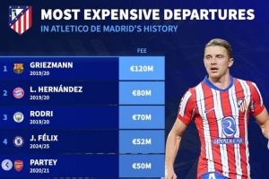 體育資訊1月15日訊 馬競已經官宣中場加拉格爾轉會熱刺,《轉會市場》也統計了馬競隊史最貴賣人情況,格列茲曼仍居首。