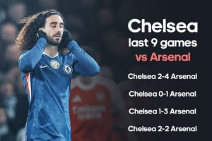 數據統計顯示,切爾西各項賽事已連續9戰阿森納均不勝,是近22年最長。他們曾在1999年到2004年間對陣阿森納連續17場不勝。
