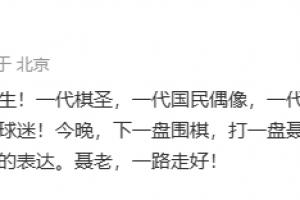 黃健翔寫道:沉痛哀悼聶衛(wèi)平先生!一代棋圣,一代國(guó)民偶像,一代大學(xué)生的圍棋啟蒙導(dǎo)師,一位真心狂熱的中國(guó)球迷!今晚,下一盤圍棋,打一盤聶老當(dāng)年中日圍棋擂臺(tái)賽的棋譜,是我個(gè)人最好的表達(dá)。聶老,一路走好! ???