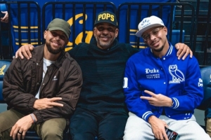 體育資訊1月15日訊 杜克大學官方社媒更新,曬出了庫里父子三人在場邊看球的合照。