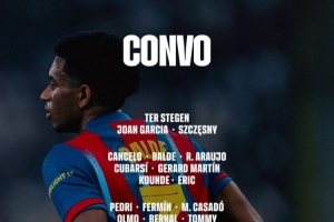 體育資訊1月15日訊 北京時間明天凌晨4點,巴薩將在國王杯16強戰中客場對陣桑坦德競技,巴薩公布了此役的球員名單,冬窗加盟的坎塞洛在列,德容停賽。