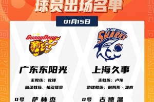 體育資訊1月15日訊 今晚19:35,廣東將在主場迎戰上海,賽前大名單出爐。