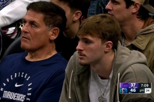 本場比賽因左腳踝扭傷缺戰的弗拉格來到了現場,并坐在球隊小老板庫班身邊觀看比賽。