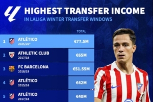 體育資訊1月16日訊 隨著出售拉斯帕多里和加拉格爾,根據(jù)德轉(zhuǎn)數(shù)據(jù),馬競(jìng)以7750萬(wàn)歐成西甲歷史上冬窗收入最高的球隊(duì)。