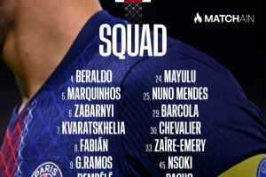 體育資訊1月16日訊 北京時間明天凌晨4點,巴黎圣日耳曼將在法甲第18輪比賽中主場對陣里爾,巴黎圣日耳曼公布了此役的球員名單。若昂·內維斯肌肉不適缺席。