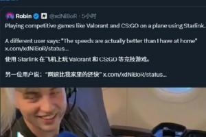 體育資訊1月16日訊 馬斯克轉載用戶在飛機上使用星鏈體驗無畏契約和CS的視頻,視頻中用戶表示除了能夠流暢游戲外,網速甚至比家里還快。