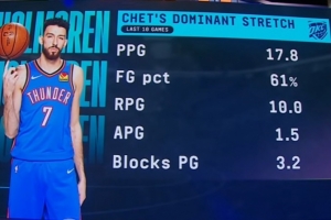 據(jù)統(tǒng)計(jì),在最近10場(chǎng)比賽中,霍姆格倫場(chǎng)均可以得到17.8分10籃板1.5助攻3.2蓋帽,投籃命中率高達(dá)61%!