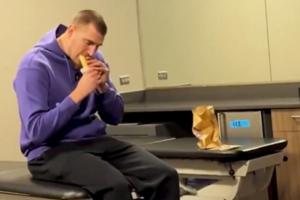 在視頻中,約基奇首先說道“因為那個(選秀廣告)我從不吃Taco Bell。”鏡頭一轉,是他在更衣室悠閑品嘗卷餅一幕。