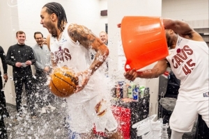 賽后,騎士官推曬圖,泰森得到了本場的比賽用球,當家球星米切爾則潑水慶祝辛森的出色表現。