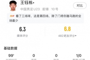 體育資訊1月17日訊 U23亞洲杯1/4決賽,國足vs烏茲別克斯坦,王鈺棟為U23國足首發出戰,加時賽第9分鐘因體力耗盡被換下,最終獲評6.3分。