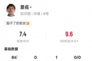 體育資訊1月18日訊 2025-26賽季英超聯(lián)賽第22輪,切爾西主場(chǎng)迎戰(zhàn)布倫特福德。恩佐首發(fā)出戰(zhàn),送出1次助攻,還有2次過人成功和3次關(guān)鍵傳球,評(píng)分7.4。