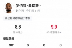 體育資訊1月18日訊 英超第22輪,切爾西2-0布倫特福德。本場比賽,藍軍首發門將羅伯特·桑切斯表現出色,貢獻全場最多的6次撲救,評分8.6全場最高。