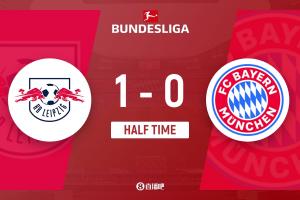 上半場(chǎng)補(bǔ)時(shí)4分鐘。半場(chǎng)戰(zhàn)罷,萊比錫1-0拜仁。