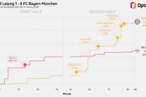 數據統計顯示,拜仁上次在德甲聯賽客場半場落后情況下在下半場打進5球,還是1976年9月:半場0-3波鴻,最終6-5獲勝。