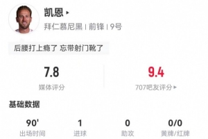體育資訊1月18日訊 拜仁在本輪德甲5-1逆轉萊比錫,凱恩本場數據如下: