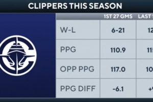 快船前27場 戰績6勝21負 場均得分110.9 場均失分117.0 場均凈勝分-6.1