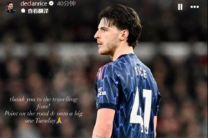體育資訊1月18日訊 在阿森納客場0-0戰平諾丁漢森林后,賴斯更新了社交媒體。