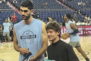 賽前,灰熊內線阿爾達馬和梅奔F1車手安東內利兩人交換了球衣。