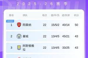 但因本輪排名第2的曼城和排名第2的維拉均吞敗仗,曼城0-2輸掉曼市德比,維拉主場0-1不敵埃弗頓,阿森納仍成功擴大分差。從上一輪的6分領先擴大至7分領先!