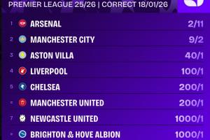 體育資訊01月19日訊 維拉0-1不敵埃弗頓,本輪過后阿森納雖然打平卻擴大了領先優勢。阿森納目前以7分優勢領跑英超,依然是奪冠的最大熱門。