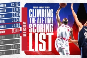 比賽第四節最后時刻,杜蘭特走上罰球線兩罰全中拿到本場比賽第18分,生涯總得分來到31562分,正式超越諾維茨基(31560分),榮升NBA歷史得分榜第六!