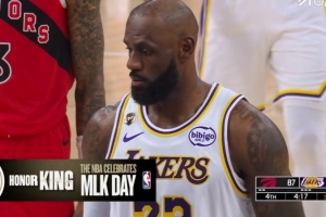 湖人VS猛龍第四節,詹姆斯隔扣造成犯規走上罰球線,主場球迷喊起MVP的呼聲。