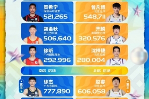 體育資訊1月19日訊 CBA官方發(fā)布了2026CBA全明星賽首發(fā)球員票選第二周票數情況。徐杰當選第二周南區(qū)票王,趙睿當選第二周北區(qū)票王。