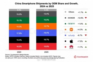 體育資訊1月19日訊 Counterpoint Research 在今日發(fā)布的新聞稿中表示,中國智能手機(jī)市場 2025 年第四季度出貨量同比減少 1.6%,而 2025 年全年的出貨則減少了 0.5%。