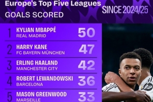 1.姆巴佩(皇馬),50球