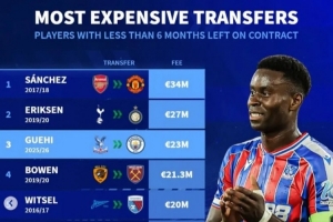 體育資訊1月20日訊 曼城已經官宣引進水晶宮中衛格伊,《轉會市場》統計顯示他也是合同僅剩不到半年情況下的歷史第3貴球員。