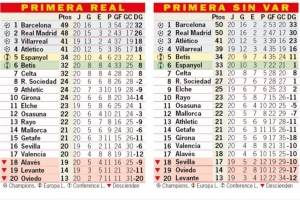 體育資訊1月20日訊 《阿斯報》統計了“如果沒有VAR”的西甲積分榜情況,巴薩將增加1分、皇馬將增加2分,兩隊將同積50分。