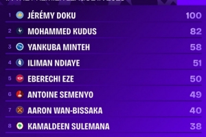 體育資訊11月10日訊 英超第11輪比賽,多庫(kù)完成7次過(guò)人,打進(jìn)1球,幫助曼城3-0擊敗利物浦。據(jù)Squawka統(tǒng)計(jì),多庫(kù)是2025年首位英超成功過(guò)人達(dá)到100次的球員。