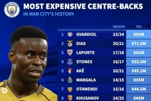 體育資訊1月20日訊 曼城已經官宣簽下格伊,《轉會市場》也統計了曼城隊史中衛引援榜,格伊僅位列第12位。