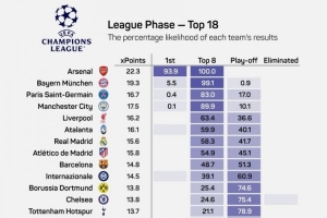 體育資訊1月20日訊 opta預測了本賽季歐冠聯賽階段的預期積分,以及直接晉級前八和參加附加賽的概率。阿森納將93.9%獲得聯賽階段頭名,拜仁僅5.5%概率獲得頭名。