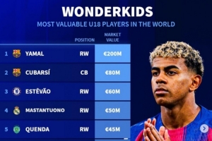體育資訊11月10日訊 《轉會市場》統計了當前世界足壇U18球員身價情況,亞馬爾無懸念2億歐獨自領跑。