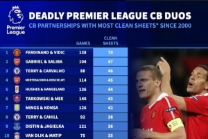 體育資訊1月20日訊 德國轉會市場統計了2000年以來英超中衛組合的零封次數,費迪南德、維迪奇70場零封居首,加布里埃爾、薩利巴47場零封次席。