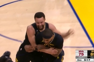GIF-小佩頓接庫里長傳上籃取分 后被前者熊抱很開心