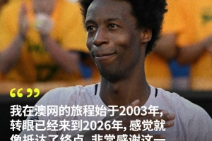 賽后,孟菲爾斯說道:“我在澳網的旅程始于2003年,轉眼已經來到2026年,感覺就像抵達了終點。非常感謝這一路精彩的旅程,太不可思議了。”