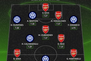 前鋒:薩卡(阿森納,7.26分)、勞塔羅(國際米蘭,7.67分)、馬丁內(nèi)利(阿森納,7.79分)