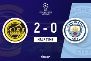 體育資訊1月21日訊 北京時間1:45,歐冠聯賽階段第7輪博德閃耀vs曼城,比賽在阿斯米拉體育場打響!上半場,阿萊恩被斷送禮,布隆伯格兩送助攻,霍格2分鐘梅開二度。半場結束,曼城暫0-2落后博德閃耀。