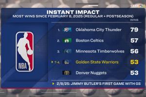 巴特勒于2025年2月8日首次為勇士出戰(zhàn),此后球隊(duì)在常規(guī)賽與季后賽共取得53勝,和掘金并列聯(lián)盟第四好
