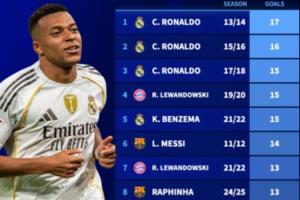而在歐冠單賽季進球排行榜上,姆巴佩距離C羅在2013/14賽季的17球紀錄還有6球之差。