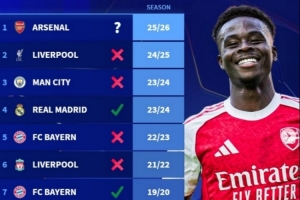 德轉也盤點了此前9支賽季前7場歐冠全勝的球隊最終戰績,其中僅23/24賽季的皇馬、19/20賽季的拜仁最終奪冠,其余包括利物浦、曼城、巴薩、米蘭等球隊最終均無緣冠軍。