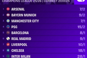 體育資訊1月22日訊 歐冠聯(lián)賽階段第7輪比賽戰(zhàn)罷,相關機構給出了歐冠奪冠的最新賠率,阿森納居首,拜仁、曼城、巴黎前四。