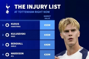 體育資訊1月23日訊 德國轉(zhuǎn)會市場列出了熱刺傷員的身價排名,庫杜斯5500萬歐居首,庫盧塞夫斯基4500萬歐次席。