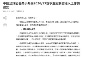 中國足協開展2026-2027賽季亞冠聯賽準入工作。2026-27賽季亞冠賽事中國足協有1+1+1個亞足聯俱樂部賽事名額,上海海港、北京國安、上海申花此前已經分別獲得了亞冠精英聯賽、亞冠精英聯賽附加賽和亞冠二級聯賽參賽資格。根據亞冠準入規定,除處于處罰期內的山東泰山外,其他前8名俱樂部成都蓉城、天津津門虎、浙江、云南玉昆也可以自愿申請亞冠賽事的準入,當前序球隊準入未通過時,通過準入的球隊將依次遞補。只有同時達成競賽成績并獲得準入牌照的球隊,才能最終將代表中國參加下賽季亞冠精英聯賽和二級聯賽。