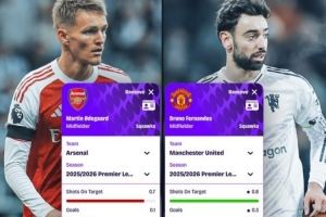 體育資訊1月23日訊 本輪英超將迎來焦點戰曼聯對陣阿森納,數據網站Squawka也盤點了兩隊中場厄德高、B費本賽季英超場均數據對比,具體如下: