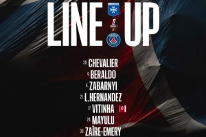 巴黎圣日耳曼首發:30-舍瓦利耶、4-貝拉爾多、6-扎巴爾尼、21-盧卡斯·埃爾南德斯、17-維蒂尼亞、24-馬尤盧、33-扎伊爾·埃梅里、7-克瓦拉茨赫利亞、9-貢薩洛·拉莫斯、29-巴爾科拉、49-姆巴耶